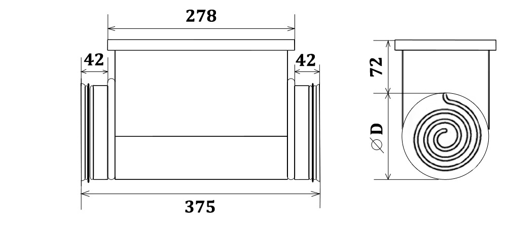 Канальный воздухонагреватель с соединительными патрубками со встроенным устройством управления. Предназначен для установки в стандартных спиральных воздуховодах.